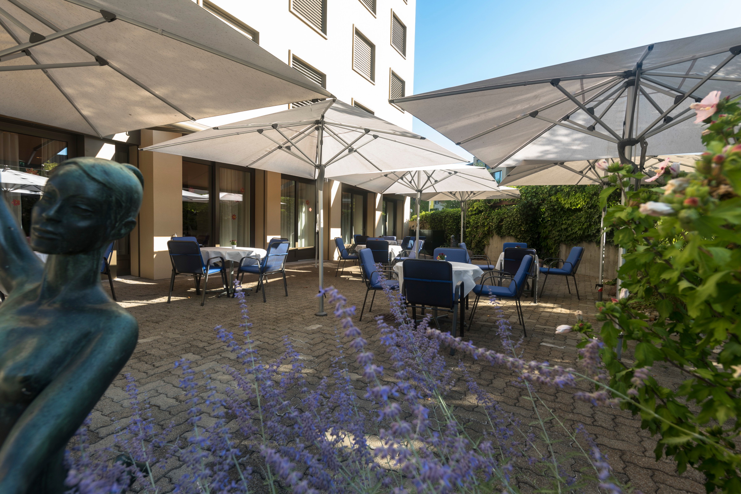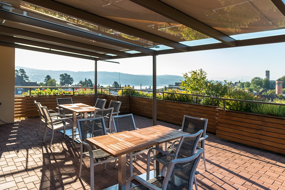 Mehrere Aufenthaltsräume und ein Gartencafé stehen unseren Bewohnerinnen und Bewohnern und deren Besuchern zur Verfügung – und natürlich auch die Dachterasse mit herrlichem Blick auf den Zürichsee, die Stadt oder den Üetliberg.